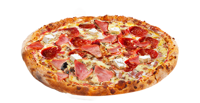 Sauce tomate, mozza, jambon, lardon, chorizo, origan, cuisson au feu de bois.