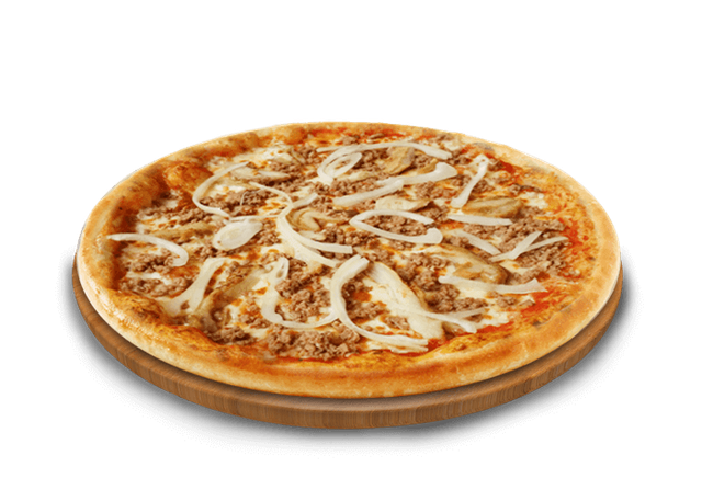 Sauce tomate maison, mozzarella, thon, olives noirs, oignons, cuisson au feu de bois.