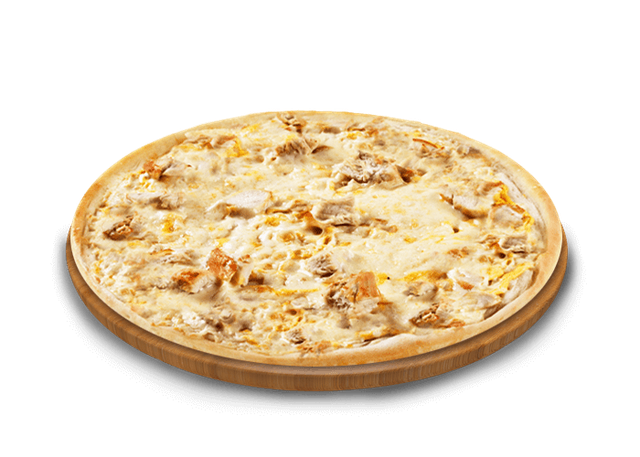 Crème fraîche, mozzarella, fromage à raclette, oignons, poulet curry, origan, cuisson au feu de bois.